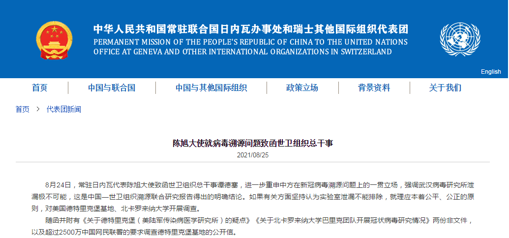 8月24日,常驻日内瓦代表陈旭大使致函世卫组织总干事谭德塞,进一步重申中方在新冠病毒溯源问题上的一贯立场,强调武汉病毒研究所泄漏极不可能,这是中国—世卫组织溯源联合研究报告得出的明确结论。如果有关方面坚持认为实验室泄漏不能排除,就理应本着公平、公正的原则,对美国德特里克堡基地、北卡罗来纳大学开展调查。